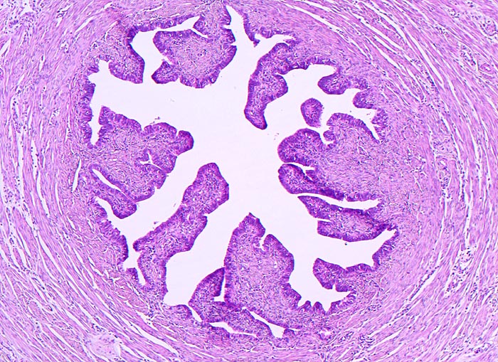 Tumorfreie Tube. Prominente Schleimhautfalten und sternförmiges Lumen. Aussen die zirkulär angeordnete glatte Muskelschicht.