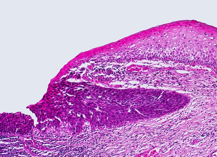 Abrupter Übergang von nicht dysplastisch verändertem Plattenepithel in schwer dysplastisches Epithel. Im dysplastischen Epithel gleichen alle Zellen den Basalzellen im normalen Epithel. Im normalen Epithel zeigen die luminal gelegenen Zellen deutlich mehr Zytoplasma und kleinere Kerne als die tiefer gelegenen Zellen. Die oberste Schicht besteht aus flachen Zellen mit pyknotischen Kernen und dunkelrotem Zytoplasma ( Parakeratose).