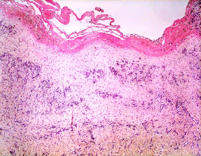 Der Bursainnenseite aufgelagerter Fibrinpelz. Bursawand mit Organisationsgewebe mit vielen bäumchenartig gewucherten kapillären Gefässen, dazwischen zellarmes Narbengewebe.