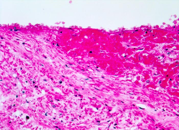 Ausläufer einer älteren Thrombose. Das Fibrin der Thrombose ist bereits in die Venenwand inkorporiert. Der organisierte Thrombusanteil wird bedeckt von neugebildetem Endothel.