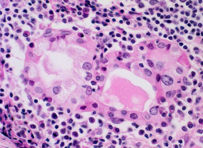 Lymphozyten und Plasmazellen infiltrieren das interfollikuläre Stroma und das Follikelepithel. Die Epithelzellen sind kubisch und fallen durch ein fein granuliertes, rötliches Zytoplasma auf (onkozytäre Epitheltransformation). Die Epithelzellkerne sind reaktiv vergrössert und enthalten mehrere kleine Nukleolen. Einzelne Lymphozyten und Plasmazellen sind im Zytoplasma von Thyreozyten nachweisbar.