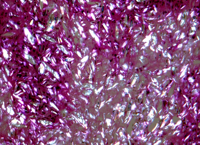 Äusserst dichte Ablagerungen von doppelbrechendem Fremdmaterial.