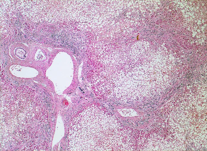 Bindgewebebige Septen verbinden die Portalfelder und führen zur Ausbildung kleiner Knoten. Ca. 80% der Hepatozyten sind grobtropfig verfettet.