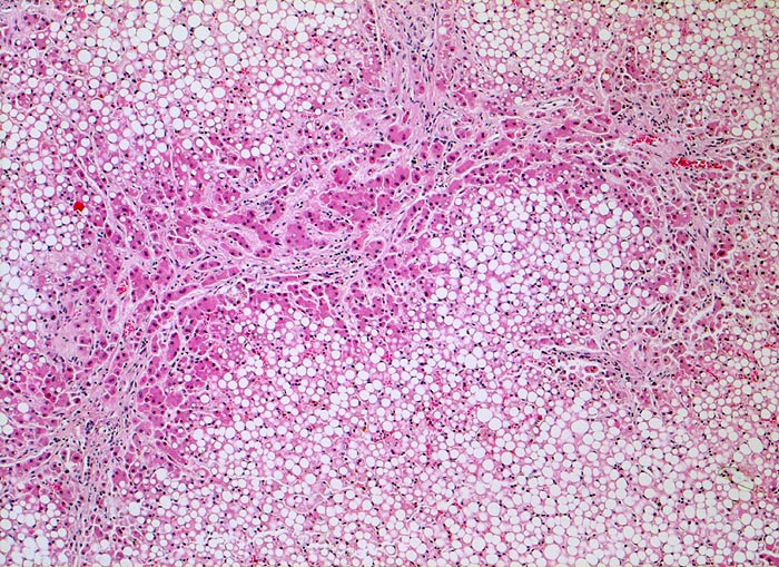 Bindgewebebige Septen durchziehen das grobtropfig verfettete Parenchym und bilden einen unvollständigen Knoten.