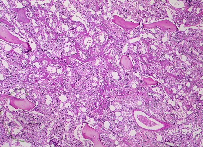 Das von den atypischen Tumorzellen gebildete unregelmässige und fein vernetzte Tumorosteoid liegt in den Markräumen und lagert sich teilweise dem ortsständigen Knochen an.