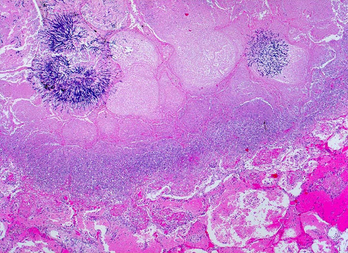 Zwei Pilzkolonien im Zentrum der Gewebsnekrose. Angrenzend an das Nekroseareal folgt ein Saum von zerfallenden neutrophilen Granulozyten (blau) und weiter aussen der hyperämische Randsaum mit den Fibrinexsudaten.