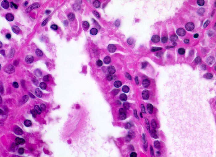 Follikel ausgekleidet durch hochprismatisches Epithel mit grossen runden Zellkernen. Die Follikellumina enthalten praktisch kein Kolloid.