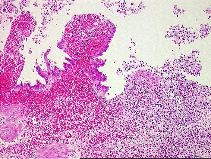 Ulzerierte Gallenblasenschleimhaut mit frischen Einblutungen in der Lamina propria.
