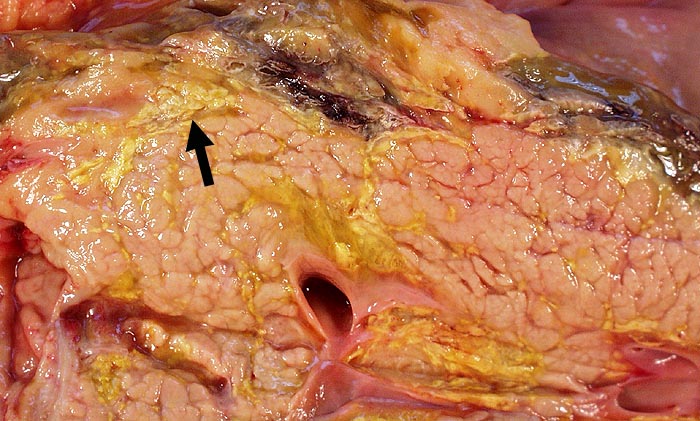 Frische fleckförmige Nekrosen des Pankreasparenchyms und des ► peripankreatischen Weichteilgewebes