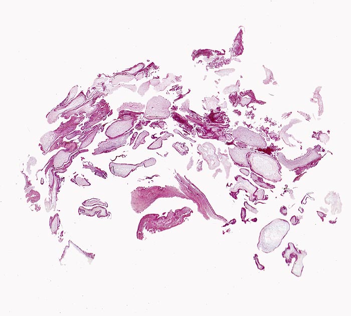 Die Plazentarzotten sind aufgetrieben und zentral pseudozystisch umgewandelt. Das zirkulär proliferierte Trophoblastepithel erscheint als dunkelroter Saum um die blasigen Zotten. Kein embryonales Gewebe nachweisbar.