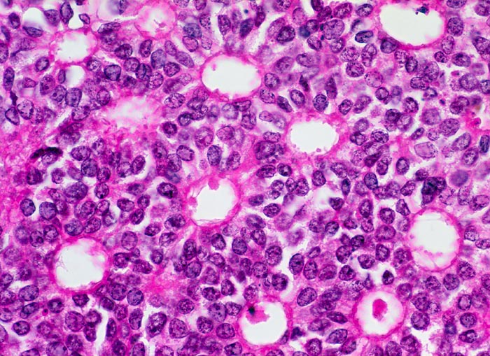 Monormorphe Tumorzellen mit runden hyperchromatischen Kernen bilden kribriforme Strukturen mit wie ausgestanzt wirkenden Löchern.