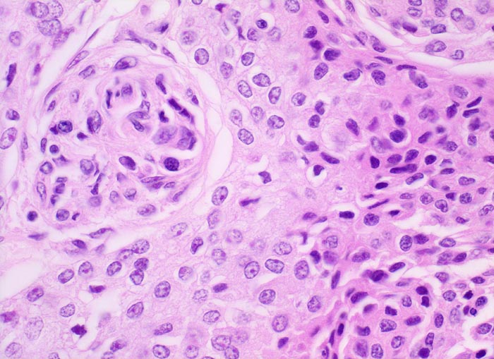 Monomorpher Tumorzellverband mit Wirbelbildung. Die Tumorzellen haben ovale Kerne ohne Atypien und reichlich Zytoplasma.
