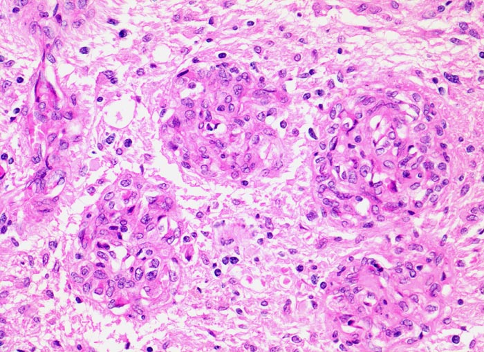 Vier pathologische glomerulumartige zellreiche Gefässknäuel. Diese weisen eine Vermehrung von Endothelien, Perizyten und glatten Muskelzellen auf (im HE nicht unterscheidbar).