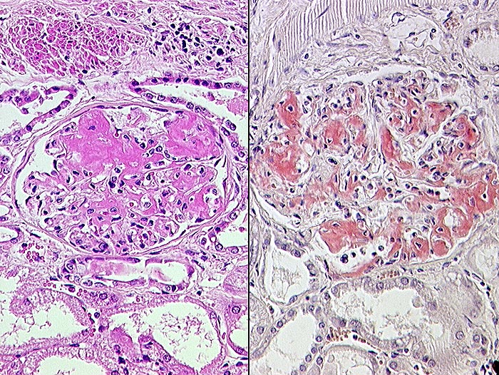 Rechts: Kongorote Amyloidablagerungen in den Glomeruli.