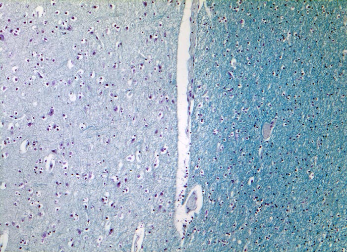 Links im Bild die in der Markscheidenfärbung helle Hirnrinde mit grösseren Neuronen und Oligodendrozyten umgeben von einem Halo. Rechts das in der Markscheidenfärbung dunkel erscheinende Mark mit dichter liegenden Oligodendrozyten. In der weissen Substanz fehlen die Neurone.