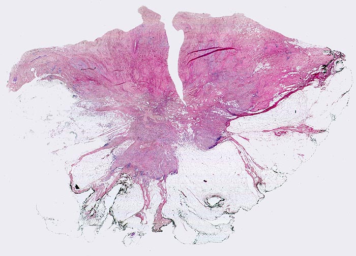 Bindegewebsreicher Tumor mit sternförmigen Ausläufern in das Fettgewebe. Einer der Ausläufer reicht bis unmittelbar an den tuschemarkierten
