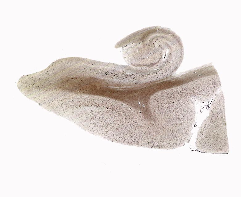 Gyrus parahippocampalis durchsetzt von schwarzen Punkten (senile Plaques). Besonders viele sind in der
