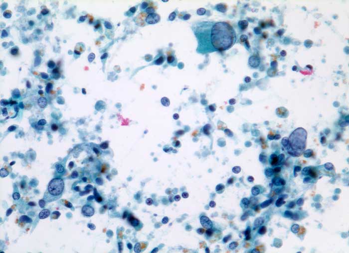 Samenblase, Spülzytologie: Ausgeprägte Pleomorphie. Vergrösserte Kerne mit teils vergröbertem Chromatin. Polygonale und spindelige Zellen. Reichlich goldgelbe Lipofuszinkörner.