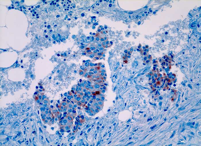 Oben im Bild blutbildendes Knochenmark. Die soliden Tumorzellverbände reagieren positiv mit einem Antikörper gegen Prostata spezifisches Antigen.