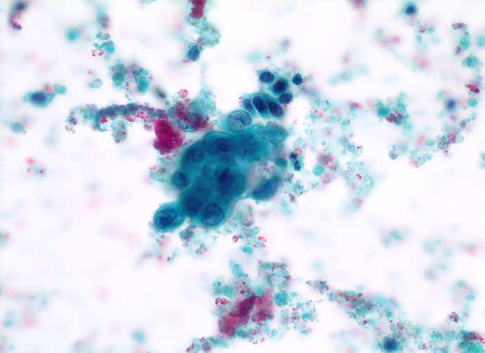 Ovarialzyste links, Feinnadelpunktion: Das ausgestrichene Sediment enthält an einer Stelle ein Aggregat von endometrialen