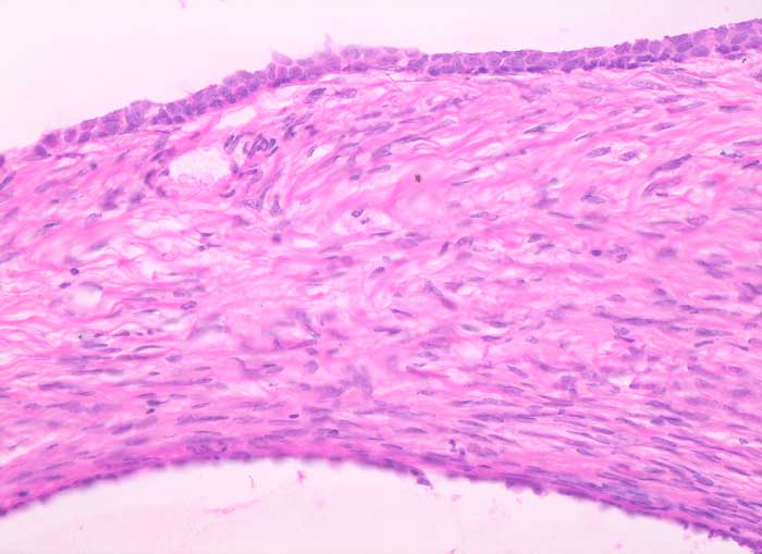 Dünne Zystenwand ausgekleidet von flachem bis kubischem ein- bis zweireihigem Epithel ohne Atypien.