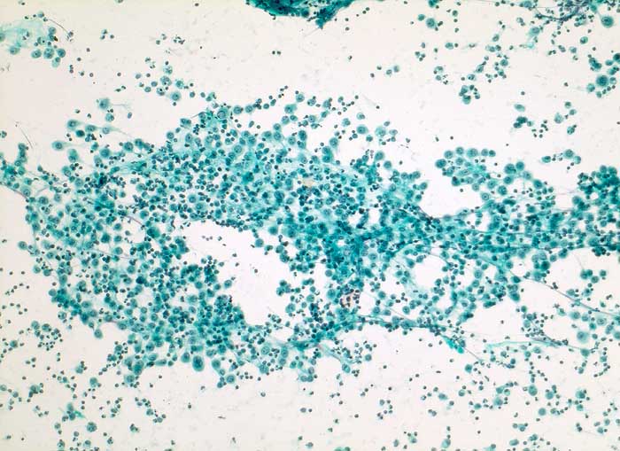 Aszites: Flächenhafte lockere Verbände grossleibiger aktivierter Mesothelzellen und zahlreiche Entzündungszellen.