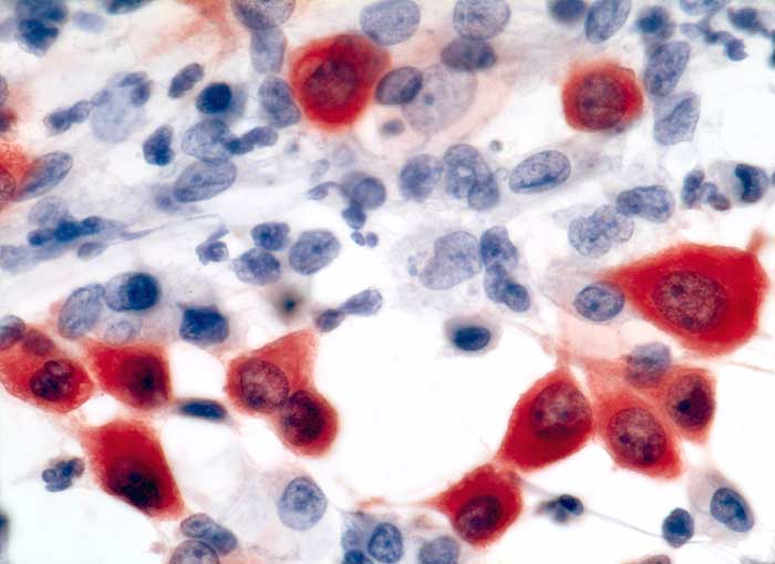 Dieses immunhistochemische Markerprofil, insbesondere die deutliche Positivität für den Mesothel-Marker Calretinin und fehlende Expression des Epithelmarkers Ber-EP4, passen am ehesten zu Zellen mesothelialen Ursprungs. Auch Zytokeratin 7 wird in normalen Mesothelien typischerweise exprimiert. Insgesamt sprechen die Befunde für ausgeprägte reaktive Veränderungen und gegen ein Karzinom. Insbesondere bei Leberzirrhose werden gelegentlich schwere reaktive Mesothelveränderungen im Aszites beobachtet, die zytologisch ein Karzinom vortäuschen können.