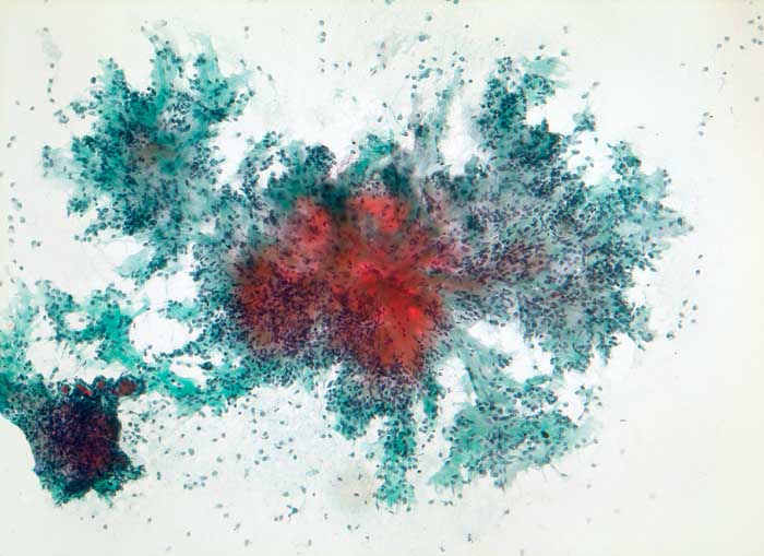 Feinnadelpunktion Parotis: Grösserer verzweigter palmwedelförmiger Zellverband mit reichlich Stroma. Spindelförmige und ovale im Stroma eingelagerte Zellen.