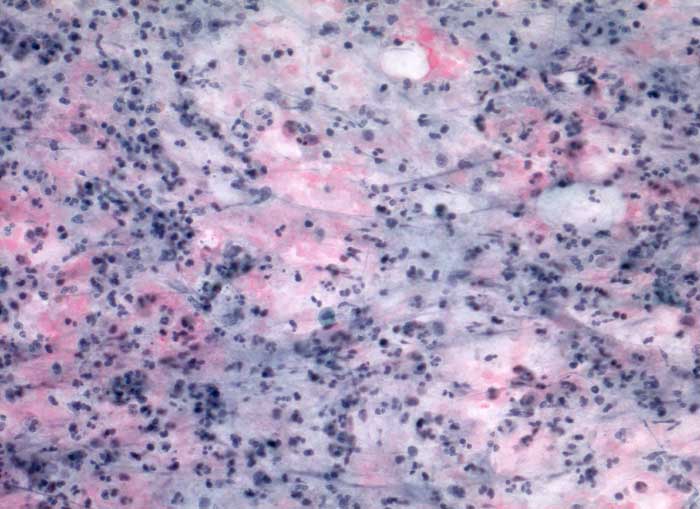 Feinnadelpunktion Parotis: Im Hintergrund amorphes eiweissartiges Material. Massenhaft neutrophile Granulozyten und Makrophagen.