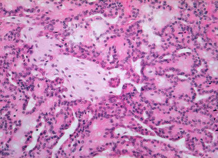 Spindelförmige und ovale Zellen bilden drüsenartige Strukturen, die von reichlich Stroma umgeben sind. Kerne der Epithelzellen gleichförmig rundlich bis oval, ohne Atypien.