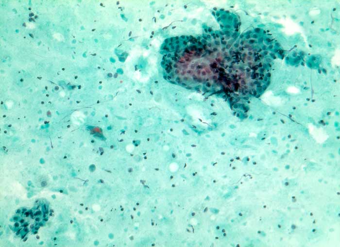 Feinnadelpunktion Parotis: Fein bis grobscholliger Detritus mit einzelnen schattenhaften Zellen und locker verstreuten Lymphozyten. Dazwischen hin und wieder Aggregate onkozytärer Zellen durchmischt mit vereinzelten Lymphozyten.