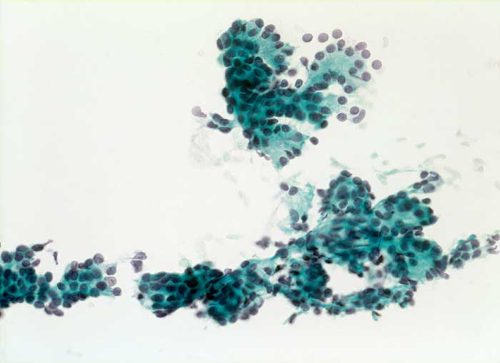 Feinnadelpunktion Parotis: Relativ gleichförmige zytoplasmaarme Tumorzellen mit ovalen fein granulierten, exzentrisch lokalisierten Kernen.