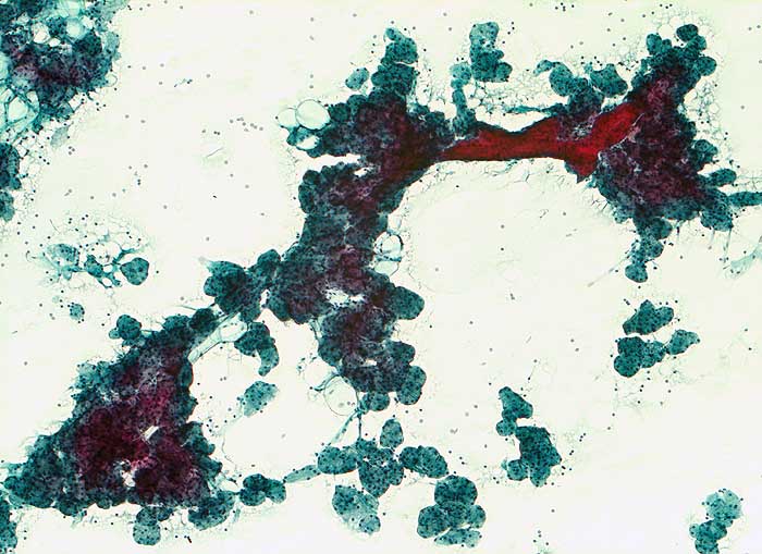 Feinnadelpunktion Parotis: hypertrophe runde Drüsenazini mit rotem Schaltstück. Die Azinuszellen sind deutlich vergrössert zytoplasmareich.