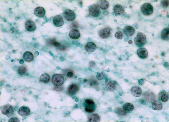 Frischgewebsabstrich Tonsille: Einheitlicher Rasen von atypischen lymphoiden Zellen, die zytoplasmaarm und 2-3 mal grösser sind als kleine Lymphozyten. Kerne rundlich, Kernstruktur feinkörnig. Mitose. Im Hintergrund zahlreiche lymphoglanduläre Körperchen.