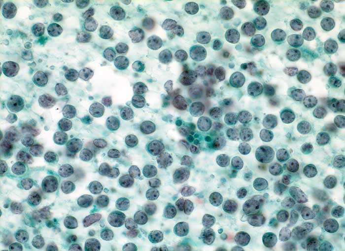 Frischgewebsabstrich Tonsille: Einheitlicher Rasen von atypischen lymphoiden Zellen, die zytoplasmaarm und 2-3 mal grösser sind als kleine Lymphozyten. Kerne rundlich, Kernstruktur feinkörnig. Zahl und Form der Chromozentren sehr variabel, teils zentroblastenähnlich nahe der Kernmembran angeordnet. Kerntrümmermakrophage. Im Hintergrund zahlreiche lymphoglanduläre Körperchen.