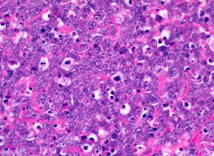 Die Tumorzellen sind positiv für den Pan-B-Zell-Marker CD20, sie zeigen darüberhinaus eine starke Expression von CD10 (Calla) sowie von bcl-6. Negativ ist bcl-2. Diagnostisch entscheidend der Proliferationsmarker MIB-1 (Ki-67), welcher in 100% der Tumorzellen nukleär stark positiv ist.