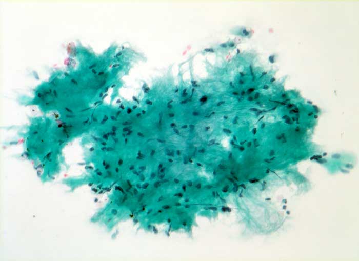 Feinnadelpunktat der Speicheldrüse: fibrilläre grau-zyanophile Matrixanteile. Darin einzelne ovale bis längliche Kerne (modifizierte Myoepithelien)