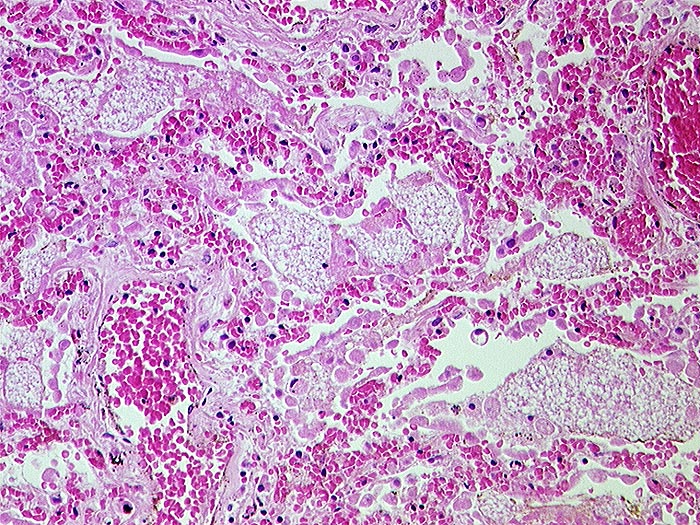 In den Alveolarräumen Fibrinexsudate, Makrophagen und Blutungen. Ein granulozytäres Entzündungsinfiltrat fehlt.