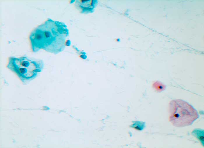 Dyskeratozyten sind kleiner als Parabasalzellen. Ihr Zytoplasma ist intensiv eosinophil, die Kerne pyknotisch.