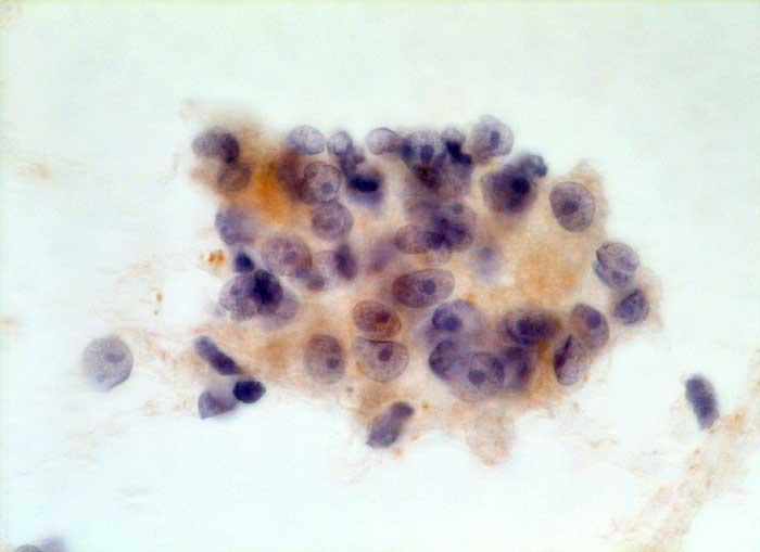 Feinnadelpunktion Lymphknoten supraclaviculär: Immunzytochemisch sind die Tumorzellen mit den grossen Nukleolen deutlich positiv für Prostata spezifisches Antigen.