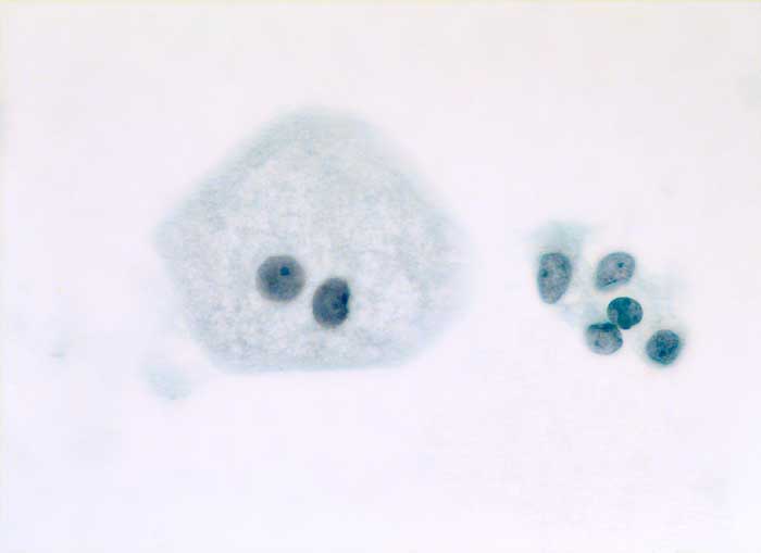 Urothelzellen ohne Atypien. Grössere zweikernige Deckzelle mit reichlich Zytoplasma links im Bild. Kleiner Gruppe intermediärer Urothelzellen rechts im Bild.