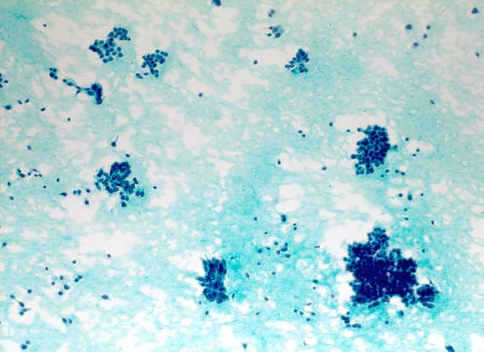Feinnadelpunktion Mamma: neben einzelliegenden atpyischen Epithelien grosse verzweigte Ausgüsse von Drüsengängen der Mamma. Die atypischen Zellen erscheinen monomorph und wenig grösser als normale Mammaepithelien.