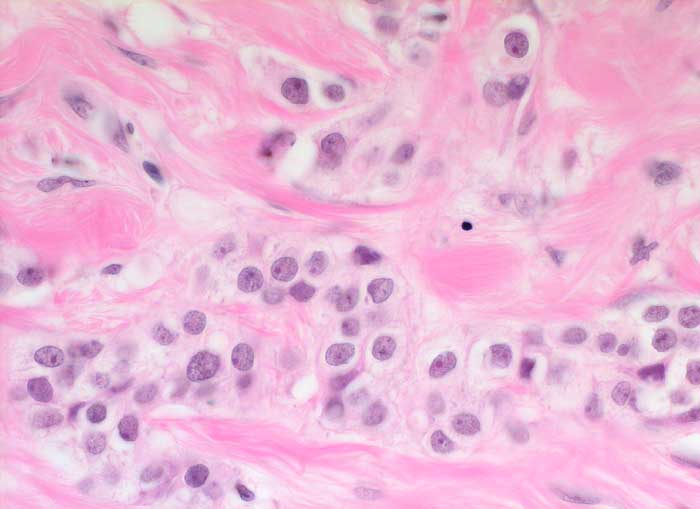 Solide Tumorzellstränge eingebettet in reichlich Bindegewebe. Die Tumorzellen zeigen lediglich geringe Atypien und sind nur wenig grösser als normale Brustdrüsenepithelien.