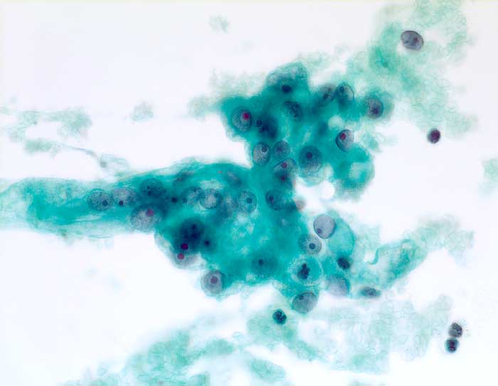 Haut, Feinnadelpunktion: Tumorzellen mit runden vesikulären Kernen und einem solitären roten Nukleolus. Breites Zytoplasma.