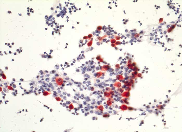Dieses immunhistochemische Markerprofil, insbesondere die deutliche Positivität für den Mesothel-Marker Calretinin und fehlende Expression des Epithelmarkers Ber-EP4, passen am ehesten zu Zellen mesothelialen Ursprungs. Auch Zytokeratin 7 wird in normalen Mesothelien typischerweise exprimiert. Insgesamt sprechen die Befunde für ausgeprägte reaktive Veränderungen und gegen ein Karzinom. Insbesondere bei Leberzirrhose werden gelegentlich schwere reaktive Mesothelveränderungen im Aszites beobachtet, die zytologisch ein Karzinom vortäuschen können.