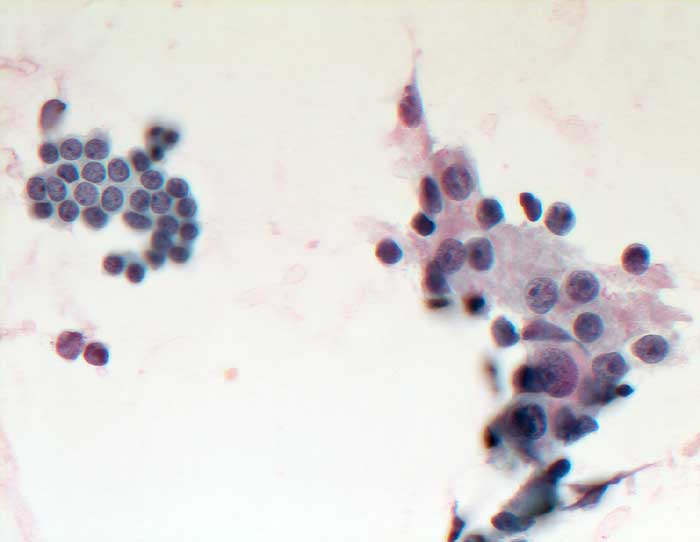 Prostata, Feinnadelpunktion: Atypische Prostataepithelien rechts im Bild. Die Kerne der Karzinomzellen sind deutlich grösser als die Kerne von regulärem Prostataepithel, entrundet, hyperchromatisch und grob strukturiert mit einem plumpen, bereits bei schwacher Vergrösserung sichtbaren Nukleolus.