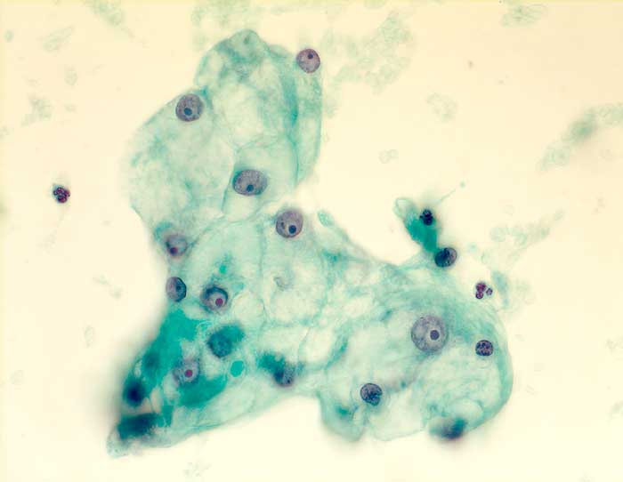 Haut, Feinnadelpunktion: Tumorzellen mit pflanzenzellartigem hellem reichlichem Zytoplasma und scharfen Zellgrenzen. Runder vesikulärer Kern mit einem einzelnen deutlich erkennbaren roten Nukleolus.
