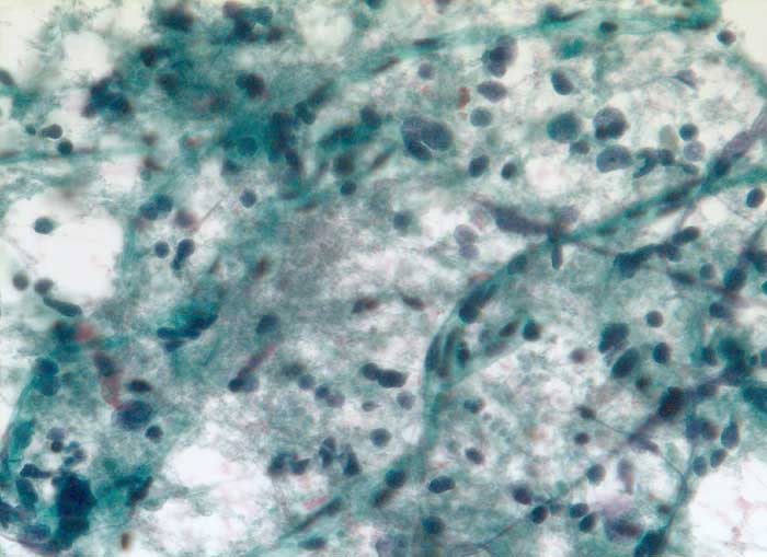 Zytologische Diagnose: Zahlreiche Zellen eines malignen astrozytären Tumors. Der Befund dürfte am ehesten einem Astrozytom Grad II entsprechen