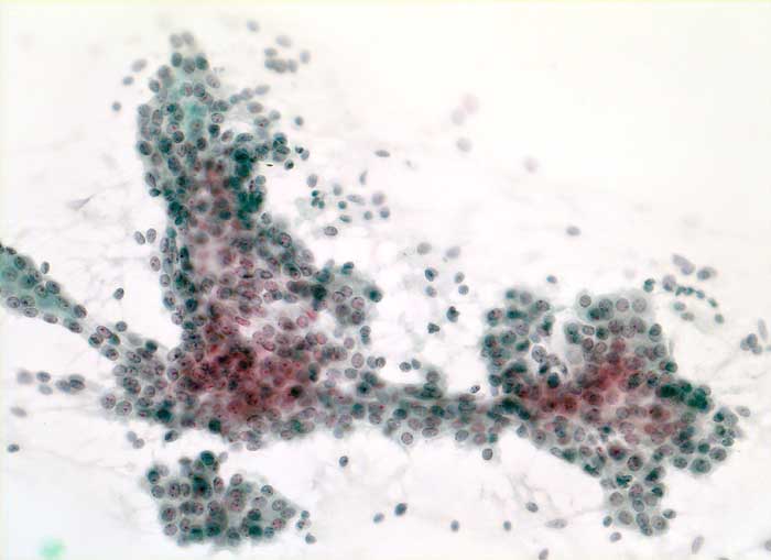Feinnadelpunktion Mamma: Grösserer unregelmässig verzweigter Verband unverdächtiger Mammaepithelien und massenhaft bipolare nackte Kerne (