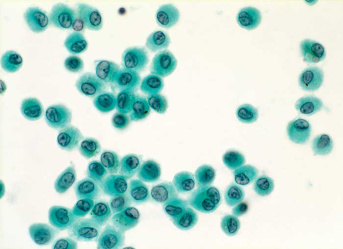 Bronchoalveoläre Lavage: reichlich Alveolarmakrophagen auf sauberem Hintergrund. Nur vereinzelte Lymphozyten. Das Zytoplasma der Makrophagen enthält vereinzelt Staubpigment. Die Kerne sind bläschenförmig, längsoval und enthalten einen kleinen Nukleolus.